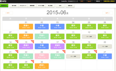 例えば週単位でシフトを組んでいる場合でも、あらかじめ出勤希望日を入力しておけば、 その日の出勤キャストのみを表示させることが可能となります。 これでキャストが多数在籍していても、出欠が明確なので、 予約の取り間違いなどを防止します。 またキャストページ(オプション)ではキャストから直接申請することも可能、 申請のあった情報はventyに届くので、管理はさらに簡単になります。